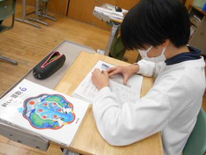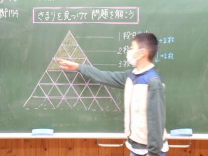 6年生は算数科で、規則性を考えて問題を解いていました。図を手がかりにどのような規則性が見つかるかを話し合っていました。