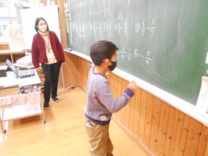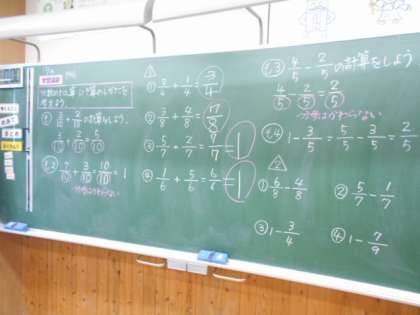 3年生は算数科で、分数の足し算や引き算の学習に取り組みました。分数の計算が速くできるようになってきました。