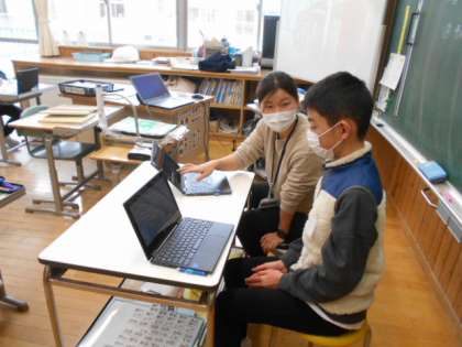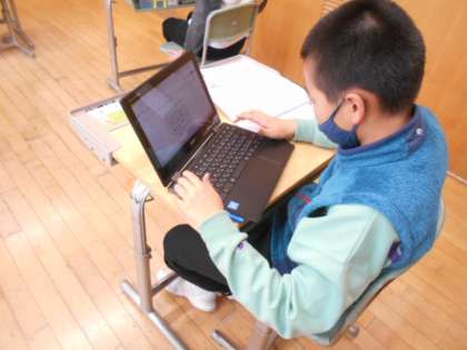 6年生は卒業文集に掲載する作文を書いています。クロムブックにある作文用紙のファイルに文字入力をしながら作成しています。