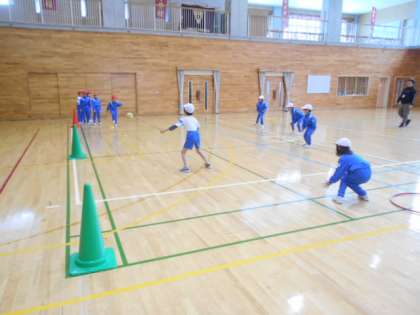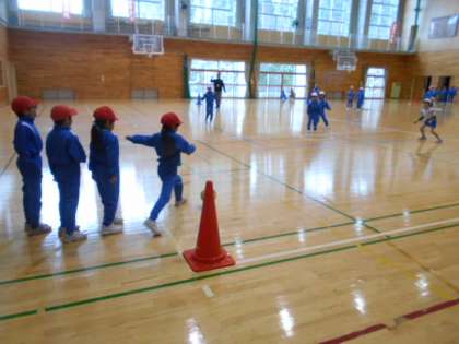 1,2年生は体育科で、キックベースボールの試しのゲームをしていました。ゲームの進め方を聞いた後、攻めと守りに役割を分けて取り組みました。