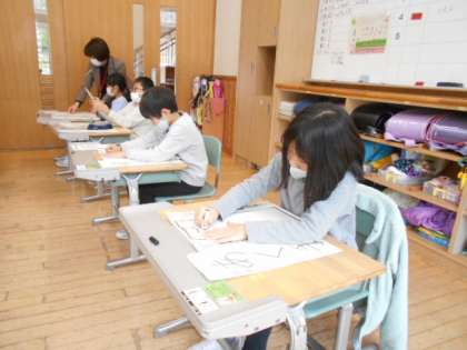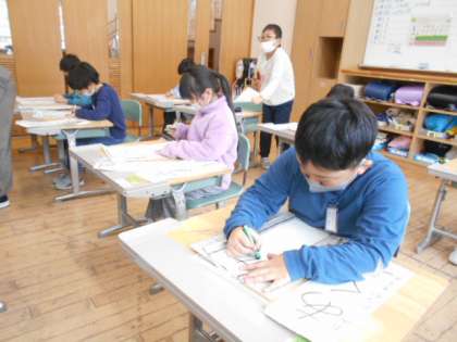 2年生は硬筆墨を使って書き初めの練習に取り組みました。お手本をよく見て、筆圧をかけて書いていました。