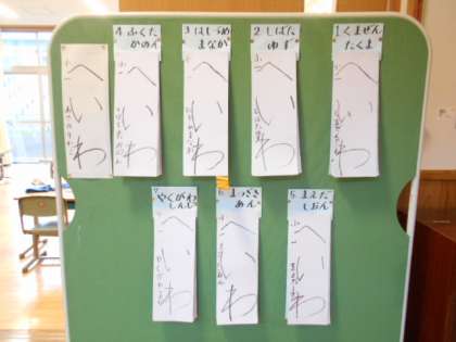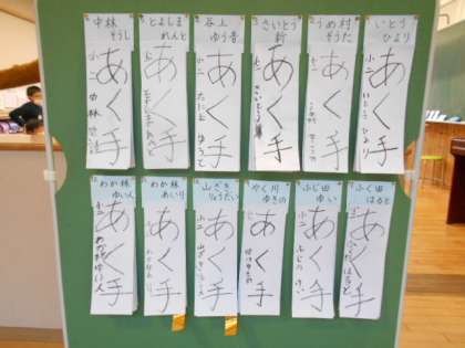 昨日行った書き初め大会で仕上げた作品を展示しました。一人一人のがんばりの成果が伝わってきます。