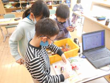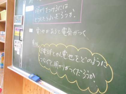 3年生は理科で、「豆電球に明かりをつけるにはどうするとよいか」という学習課題で実験に取り組みました。豆電球だけでなく、モーターの働きに興味津々の様子も見られました。