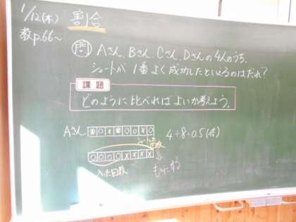 5年生は算数科で、もとになる量と比べられる量を明らかにしながら割合を考える学習に取り組みました。