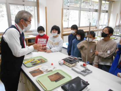 4年生は理科で熱伝導の様子を実験で確かめました。金属板に貼ったサーモテープが変色している様子をしっかりと観察していました。