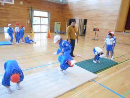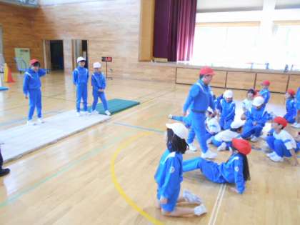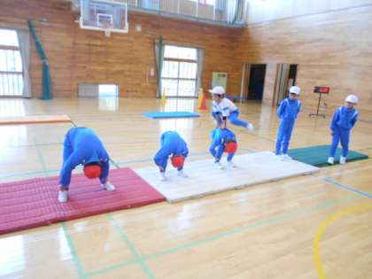 今日は1〜3年生の合同体育がありました。3年生がお手本の動きを見せてリードする場面が見られました。