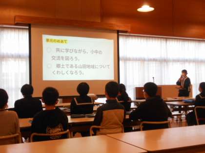 1月と2月に6年生と中1生徒は「山田地区の自然」をテーマに合同で総合的な学習の時間を行います。今日は1回目の学習に望みました。