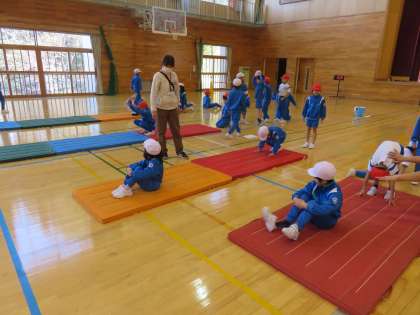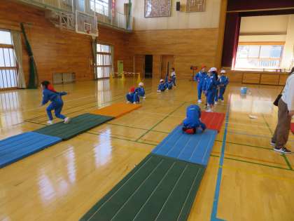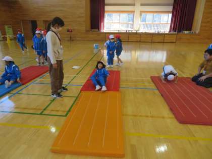1〜3年生は体育の学習で、マット運動に取り組みました。素早く回転する前転の技能を高めました。