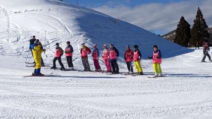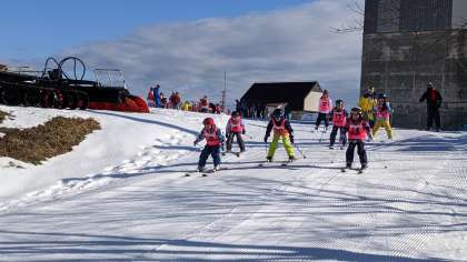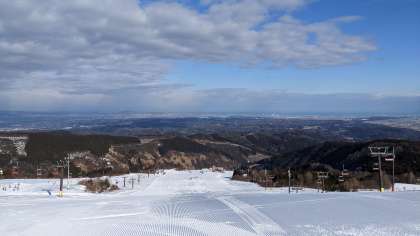 スキー教室が始まりました。山頂付近は風がありますがとてもよい天気です。