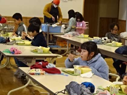 25日は「ピーマンマンと夜ふかし大まおう」の登場人物を取り入れた献立でした。苦手な人が多いピーマンですが、食べやすい味付けで調理されていて、子供たちはおいしそうに食べていました。