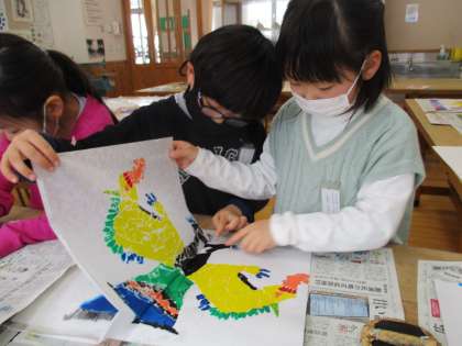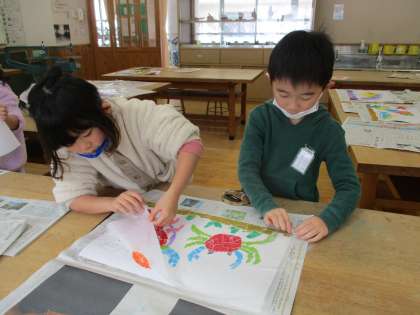 今日は、いよいよ刷りでした。台紙に貼ったシールのカラーを、濡らした紙に写します。友達と協力しながら、活動しました。