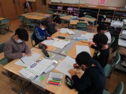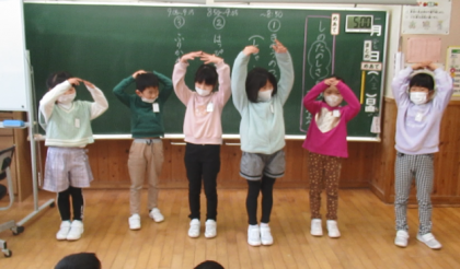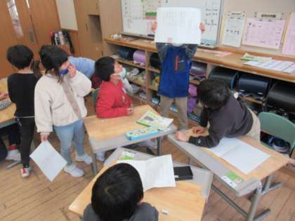 国語科の合同学習3回目は、詩を音読するグループと詩を視写するグループに分かれて学習しました。グループの友達と一緒に、詩を視写して絵を描いたり、音読をするときに動きや振り付けをつけたりしました。その後、発表会をし、お互いのよいところを伝え合いました。合同で学習をすることで、子どもたちは、たくさんの詩に触れ合い、様々な考えや感じ方を伝え合うことができました。
