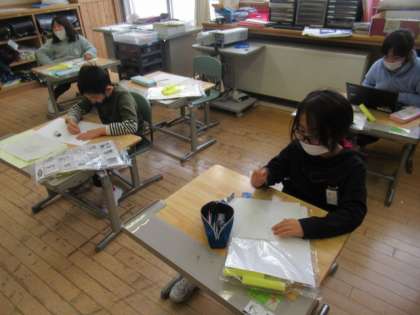 図画工作科では、版画に挑戦します。子供たちは、動物をテーマに版画で使う型紙をかきました。また、背景にするものを決めてかいていました。次は、ローラーを使って色をつけていきます。