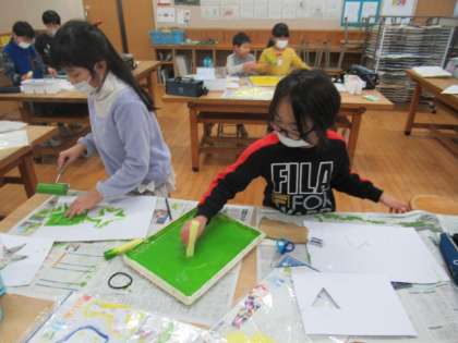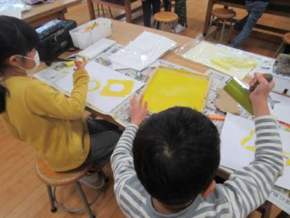 ローラーを使って背景の色をぬるための練習をしました。子供たちは、背景に浮き出る模様を工夫したり、重ねる色を何にするかを考えながら、作品を作っていました。次回は、自分の作品に実際に色を塗っていきます。