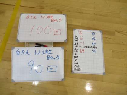1〜3年生は、色団別の「大縄8の字跳び」の目標を考えて練習を重ねました。