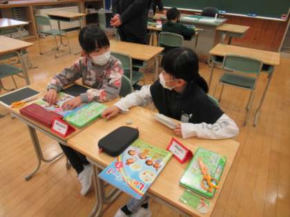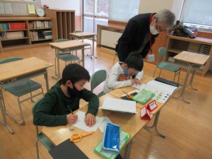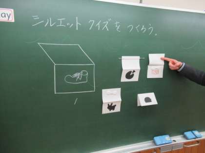 3年生は外国語活動の学習で、シルエットクイズを楽しみました。ALTの先生のクイズに答えた後、自分でシルエットが分かる絵を描いて問題をつくりました。
