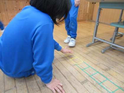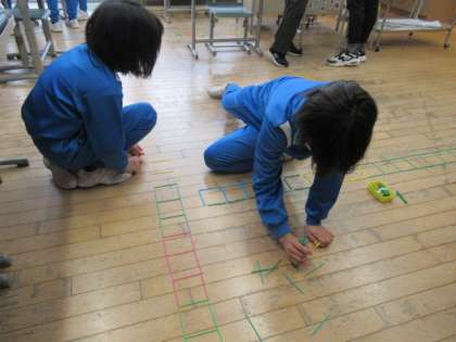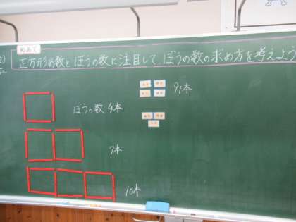 5年生は算数科で、2つの量の変わり方のきまりを考えました。子供たちは、四角形の数が増えるにつれて辺の数がどのように変わるのかを調べながら、そのきまりを考えていました。