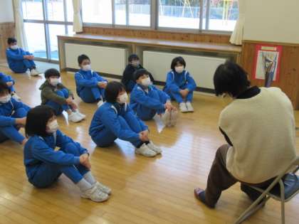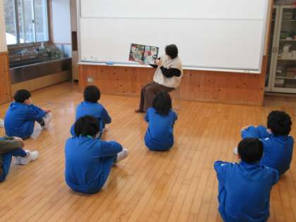 5,6年生は、本の読み聞かせをしていただきました。子供たちは絵本の挿絵に注目して真剣に聞き入っていました。