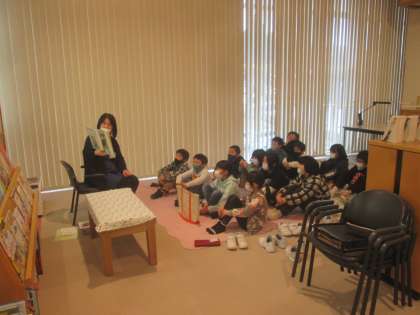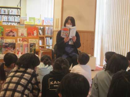 図書館司書の先生による「読み聞かせとおすすめの本紹介」がありました。読み聞かせしてもらった「おすしやさんにいらっしゃい!」という本では、海のいきものが、料理されておすしになるまでの様子が詳しく書かれており、子供たちは、興味をもって話を聞いていました。
