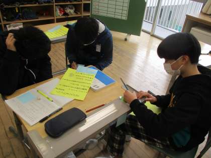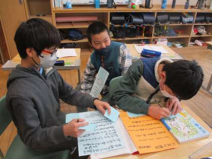 小学校生活での思い出を、詩に表しました。反復表現やオノマトペの活用等、一人一人が熟考して仕上げた作品です。グループで作品を見合い、すてきなところを伝え合いました。