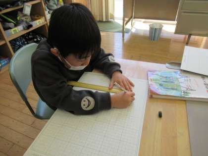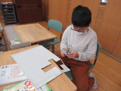2年生は算数科で、方眼紙を用いて箱の形作りに取り組みました。まず、6つの面の大きさを調べて、方眼紙を切り取っていました。