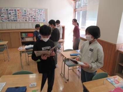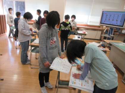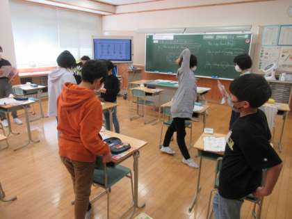 5年生は外国語科で、「友達の好きなことを伝えよう」という課題で学習しました。インタビューして、分かったことを伝え合っていました。