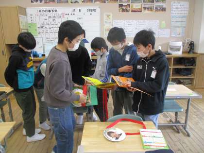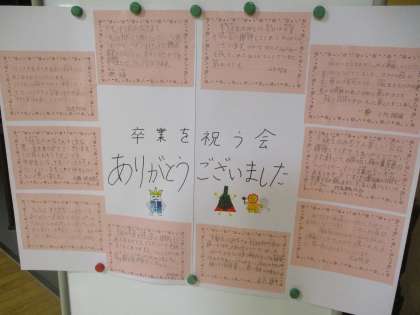 卒業を祝う会を終えて教室に戻ると、子供たちは嬉しそうにプレゼントを読んでいました。お返しに手紙を書き、児童玄関に掲示しました。下級生のみなさん、どうもありがとう!