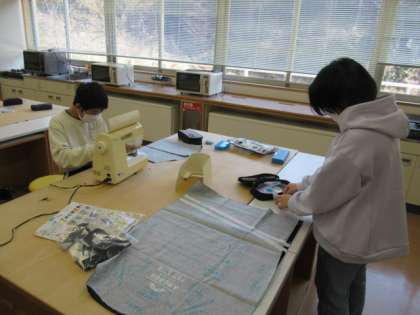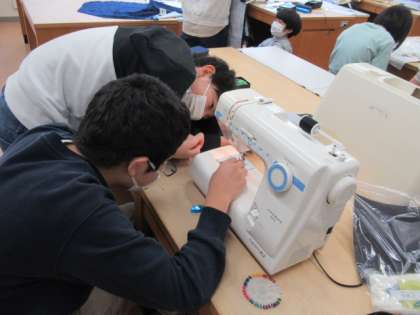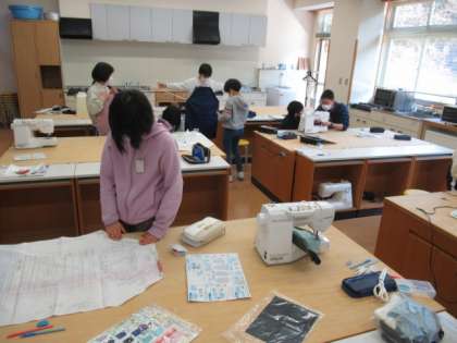 5年生は家庭科でエプロン作りに取り組みました。寸法を合わせたり、マチを作ったり、ミシン縫いしたりして製作を進めました。