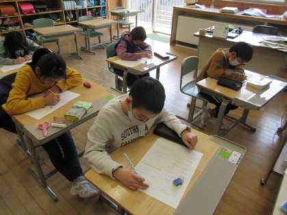 3,4年生は、それぞれの学年の3学期のたしかめテストを行いました。家庭学習で復習した成果を発揮してほしいですね。