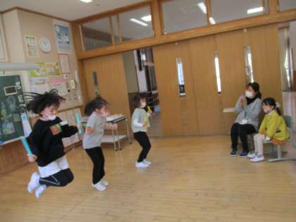 縄跳び発表では、あや跳びや二重跳び等、難しい技に挑戦。ゲーム「何でもバスケット」では、何を言おうか、どう行動するか迷う園児に、優しくアドバイス。くじびきでは、たくさんの景品を準備してプレゼント。