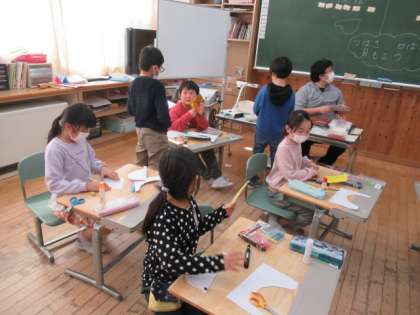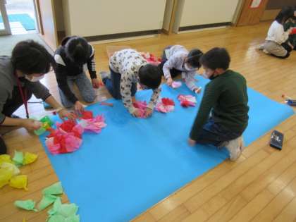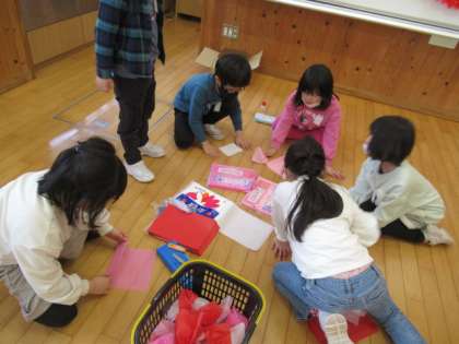 1〜4年生は合同で、卒業を祝う掲示物を作りました。お花紙を作ったり、ハトの型紙を切り抜いたりと、役割分担をして作業を進めました。