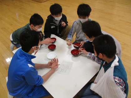 給食ボランティア委員会企画の「豆つかみ大会〜2人グループの部〜」を行いました。小さな豆を慎重につまみ、お皿へ移す子供たちは、とても真剣な様子でした。