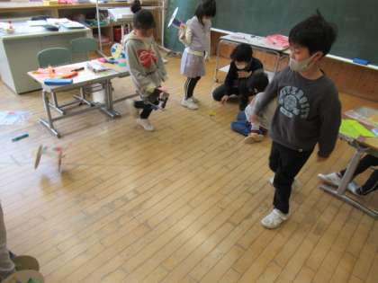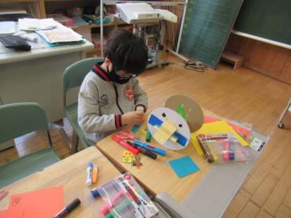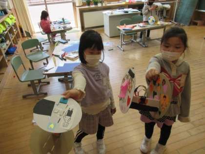 転がして遊ぶおもちゃが完成しました。車輪や車軸に飾り付けをして、くるくる回る様子を楽しみました。