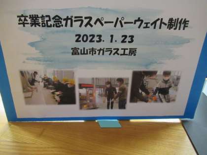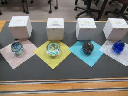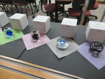 6年生が卒業記念作品として制作したガラスのペーパーウエイトが、職員室前に展示してあります。大切に使ってください。