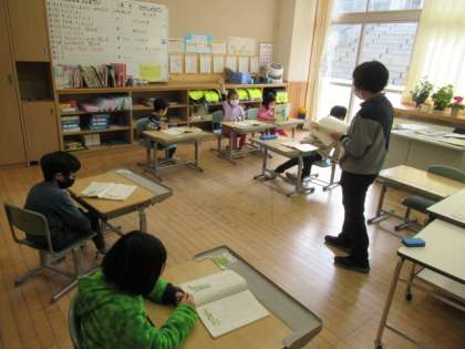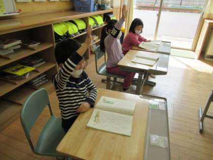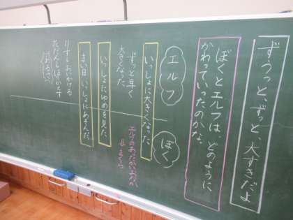 1年生は国語科で、物語文「ずっとずっと大好きだよ」に登場する「ぼくとエルフ」がどのように成長していったのかを読み取りました。