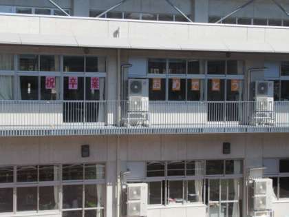 中学校の卒業式をお祝いするために、小学校の教室にメッセージカードを張りました。