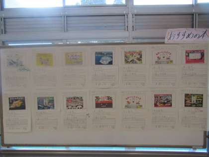 子供たちは、友達の書いたおすすめの本が何かを見て、「図書館で借りてみよう。」と言っていました。