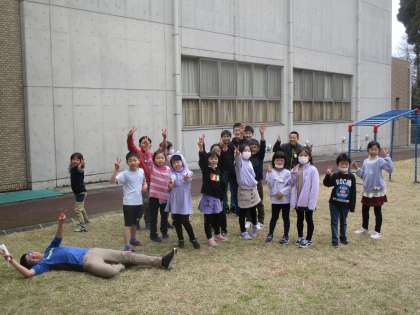 休み時間に、たくさんの子供たちがけいどろをして遊んでいました。「写真撮ってー!」と集まってきた子供たち。6年生と過ごす最後の休み時間を楽しんでいました。