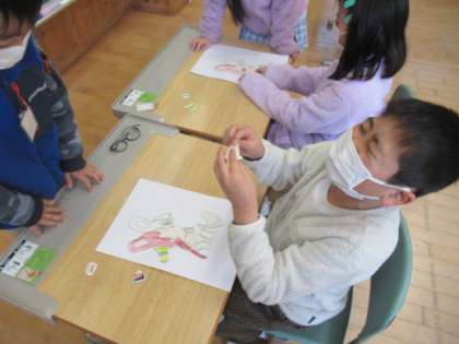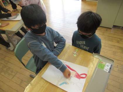 参加した子供たちは、ペアになって福笑いをし、「もっと右だよ。」「もう少し上だよ。」など、声を掛け合い楽しく遊ぶことができました。