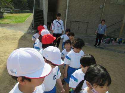 全校での体育を前に、1年生と一緒にグラウンドに移動しました。2年生はおにいさん・おねえさんとして、「ここに並ぶよ」と優しく声をかけていました。素敵な姿です。