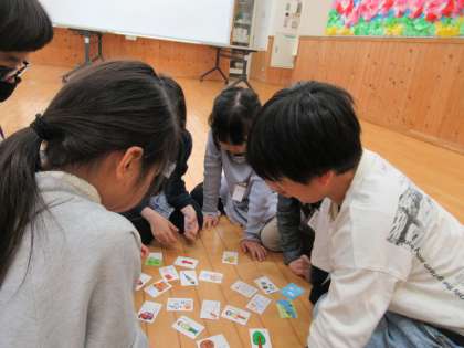 国語の時間に、1年生で習った漢字のかるたをしました。読みを答えたり、指でなぞって書き順を確認したりしました。楽しみながら漢字の復習ができました。