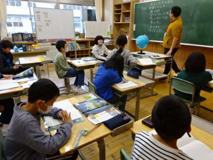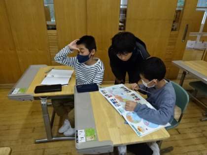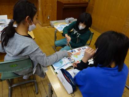 「世界の国の国土」の学習で、地球儀を見ながら国土の様子を確認したり、教科書に掲載されている国旗や世界地図を見ながら、国の名前を書き込んだりしました。友達と教え合ったり確かめ合ったりしました。