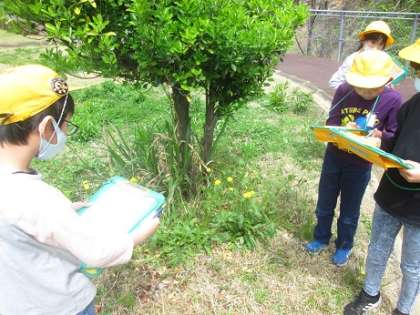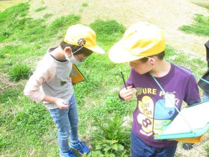 春の植物や生き物を観察しました。見つけた特徴について友達と話し合い、メモをしていました。
