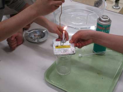 物を燃やすはたらきのある気体は、ちっ素・酸素・二酸化炭素のうちどれなのか、実験をして確かめました。
