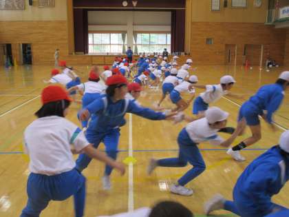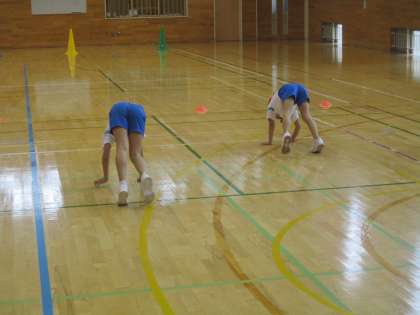 全校で体育の授業を行いました。イヌやクマ等の動物の歩き方のマネをしたり、チームに分かれて追いかけっこをしたりしました。