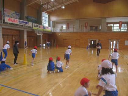 終わりに、6年生と5年生、4年生と3年生、2年生と1年生がペアになって背中合わせになって追いかけっこをしました。