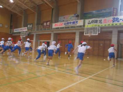 今日も、全校で体育の授業を行いました。様々な体勢からスタートして、走りました。