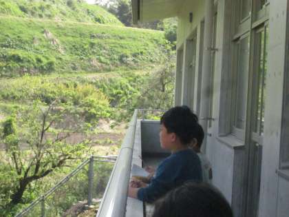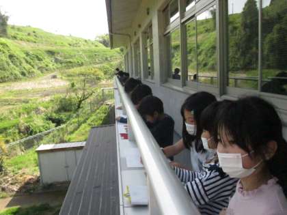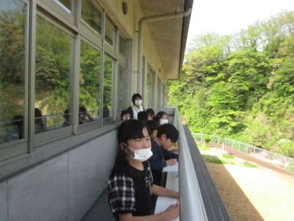 学校の周りにはどんな土地利用になっているか、建物があるか等調べました。高いところから東西南北の方位を見て、それぞれの方位で様子が違うことに気付いていました。