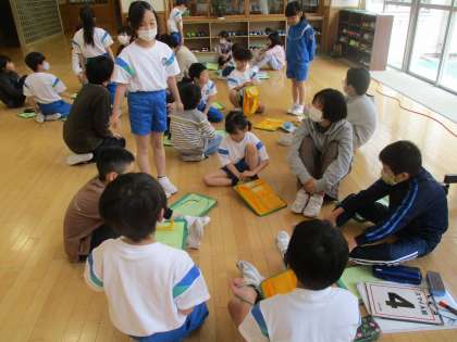 縦割り班の顔合わせがありました。自己紹介をした後、5月2日(火)に行われるスマイル班遠足の目当てを決め、班ごとに遊びました。