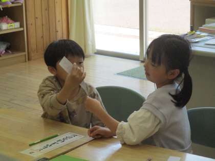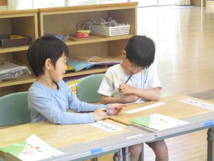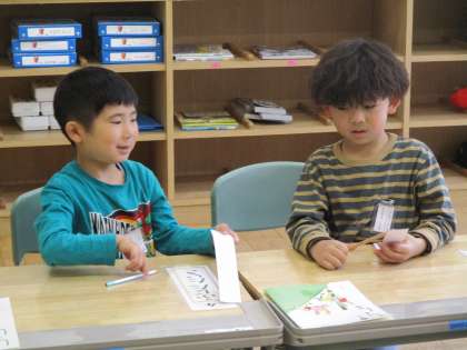 その後は、はじめての名前を書き、隣の友達と見せ合いました。1年後、もう一度名前を書いて比べてみようねと約束しました。